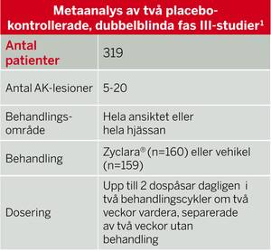 Zyclara® kräm 3,75% (imikvimod). Rx, F. ATC-kod: D06BB10. Indikation: Topikal behandling av kliniskt representativa, icke-hyperkeratotiska, ickehypertrofiska, synliga eller palperbara aktiniska keratoser i ansiktet eller på skalpen hos immunkompetenta vuxna när andra lokala behandlingsalternativ är kontraindicerade eller mindre lämpliga. Varningar och försiktighet: Imikvimod har immunstimulerande egenskaper. Ska användas med försiktighet till immunsupprimerade patienter. Kan ge lokala hudreaktioner och influensaliknande symtom. Bör inte appliceras på icke-läkt hud. Kontakt med ögon, läppar eller näsborrar ska undvikas. Patienter ska uppmanas att vidta lämpliga solskyddsåtgärder och minimera eller undvika exponering UV-strålning. Behandling under graviditet och amning endast om den potentiella fördelen berättigar den potentiella risken för fostret eller barnet. Produktresumé senast uppdaterad: 2025-07. För ytterligare information se www.fass.se. Viatris AB Tel: 08-630 19 00