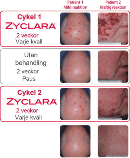 Zyclara® kräm 3,75% (imikvimod). Rx, F. ATC-kod: D06BB10. Indikation: Topikal behandling av kliniskt representativa, icke-hyperkeratotiska, ickehypertrofiska, synliga eller palperbara aktiniska keratoser i ansiktet eller på skalpen hos immunkompetenta vuxna när andra lokala behandlingsalternativ är kontraindicerade eller mindre lämpliga. Varningar och försiktighet: Imikvimod har immunstimulerande egenskaper. Ska användas med försiktighet till immunsupprimerade patienter. Kan ge lokala hudreaktioner och influensaliknande symtom. Bör inte appliceras på icke-läkt hud. Kontakt med ögon, läppar eller näsborrar ska undvikas. Patienter ska uppmanas att vidta lämpliga solskyddsåtgärder och minimera eller undvika exponering UV-strålning. Behandling under graviditet och amning endast om den potentiella fördelen berättigar den potentiella risken för fostret eller barnet. Produktresumé senast uppdaterad: 2025-07. För ytterligare information se www.fass.se. Viatris AB Tel: 08-630 19 00
